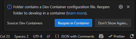 - You should see a popup in the bottom right corner asking if you want to reopen the folder in a Dev Container, click