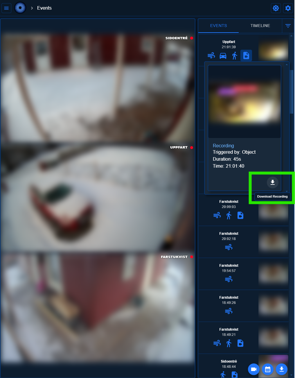 To view event recordings, go to the Events tab on the Events page. Here you can see all events that have been detected and recorded.